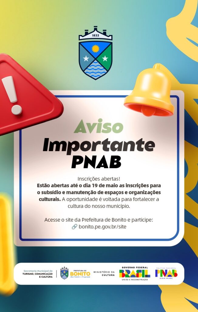 Estão abertas as inscrições para o Edital de Subsídio e Manutenção de Espaços e Organizações Culturais que tem como objetivo selecionar espaços, ambientes e iniciativas artístico-culturais para receberem subsídio para manutenção, visando incentivar as diversas formas de manifestações culturais do município de Bonito – PE, de acordo com o Art. 5° item XIII (manutenção de grupos, de companhias, de orquestra e de corpos artísticos estáveis, inclusive processos de produção e pesquisa continuada de linguagens artísticas) de acordo com a Lei nº 14.399, de 8 de julho de 2022.