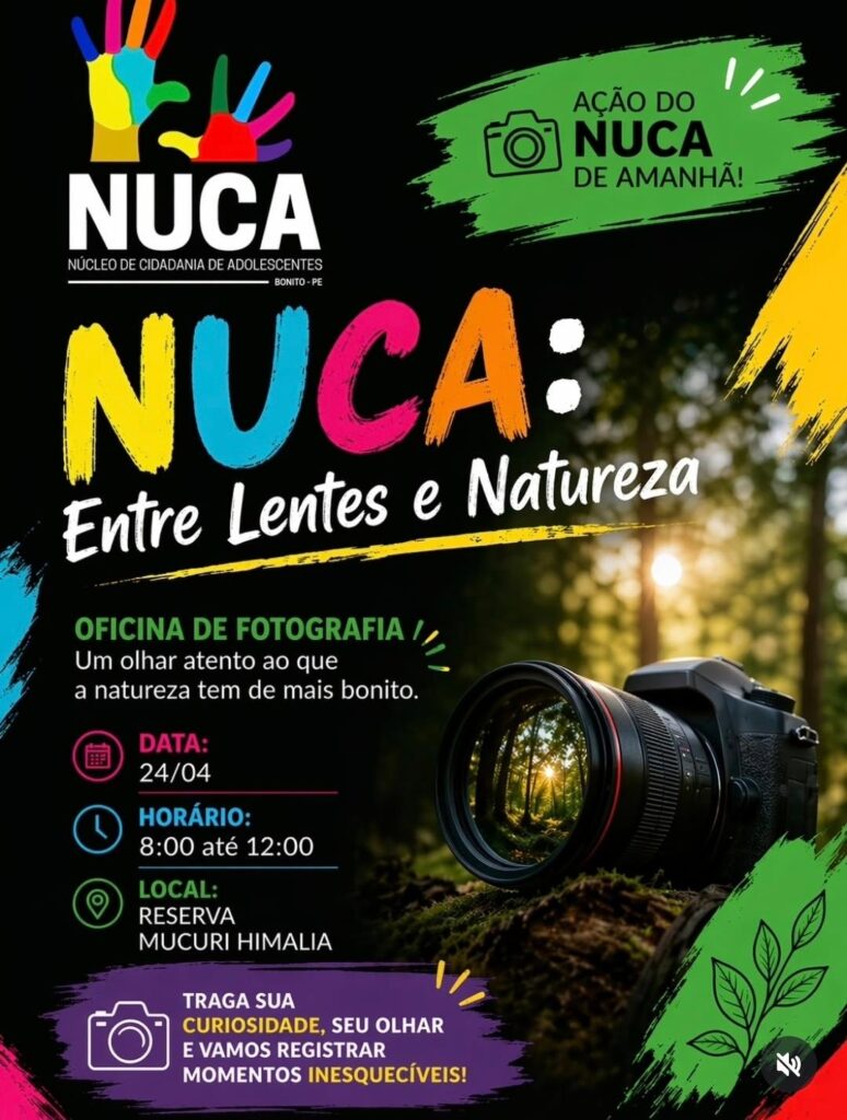 O Núcleo de Cidadania de Adolescentes (NUCA) de Bonito-PE, anunciou a realização de uma oficina de fotografia intitulada “NUCA: Entre Lentes e Natureza”. Com a proposta de oferecer um olhar atento às belezas naturais da região, a iniciativa busca integrar o desenvolvimento de habilidades técnicas com a conscientização ambiental entre os jovens participantes. O evento faz parte das ações do “NUCA de Amanhã!” e incentiva o registro de momentos inesquecíveis através das lentes.